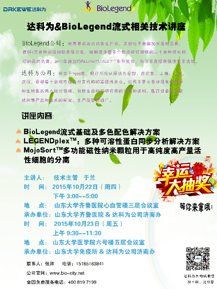 10月22日至23日,分別由山東大學(xué)齊魯醫(yī)院 、山東大學(xué)免疫所和達(dá)科為生物濟(jì)南辦共同承辦的流式專家講座,在山東大學(xué)齊魯醫(yī)院心血管三樓會(huì)議室和六號(hào)樓五層會(huì)議室如期舉行。