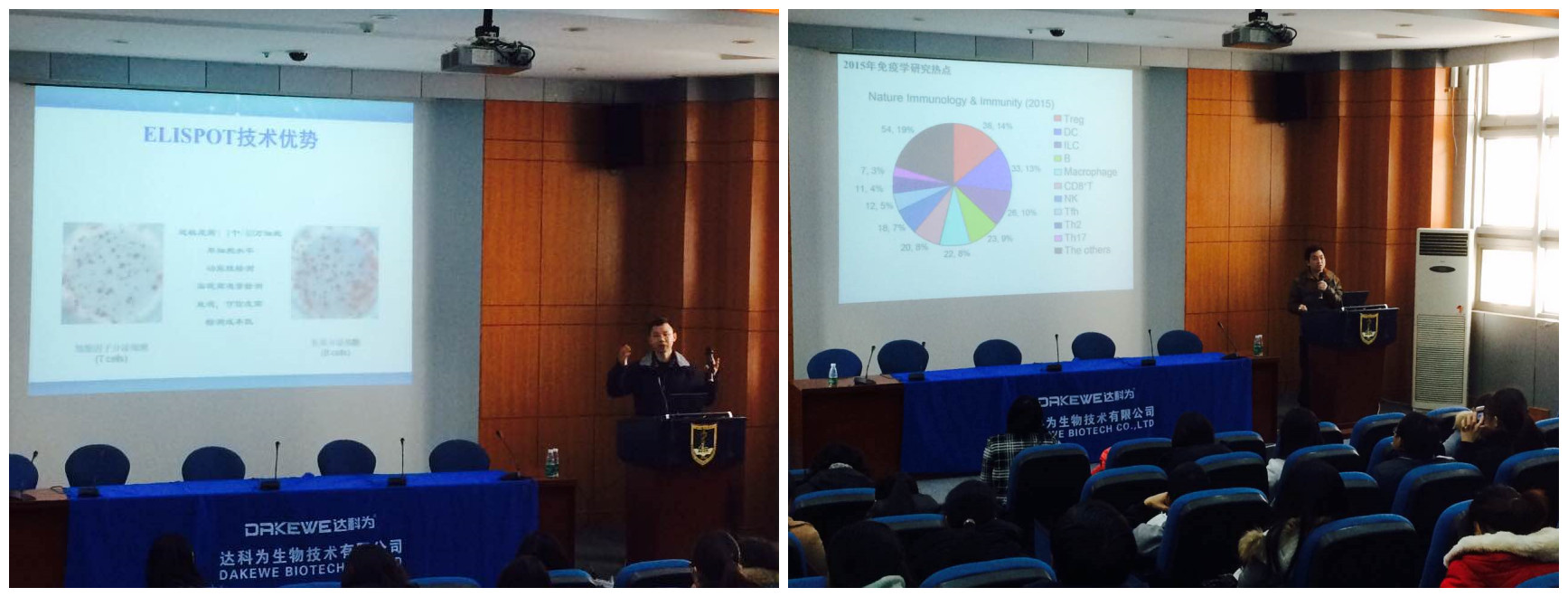 1月8日上午九點(diǎn),第二天的理論課程開始了。首先是達(dá)科為生物工程中心周翔經(jīng)理作報(bào)告。周翔經(jīng)理講述了ELISPOT的原理、刺激劑的選擇、斑點(diǎn)結(jié)果判定以及ELISPOT的應(yīng)用等。