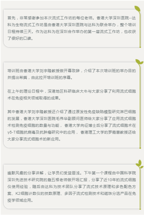 第二日的十色實(shí)操日程中,在達(dá)科為流式技術(shù)團(tuán)隊(duì)指導(dǎo)下,每位參加的學(xué)員均有機(jī)會(huì)自己操作前期染色和后期數(shù)據(jù)處理,并且由深圳先進(jìn)院的詹五根老師演示上機(jī),大家收獲頗豐,參與學(xué)員人數(shù)達(dá)到40余人。