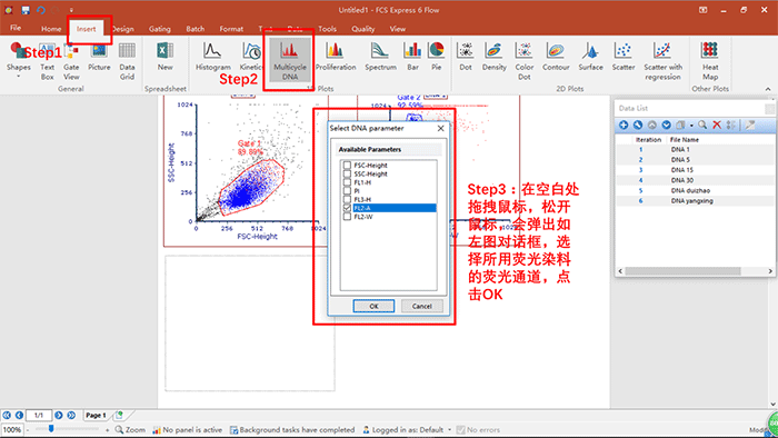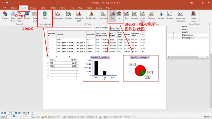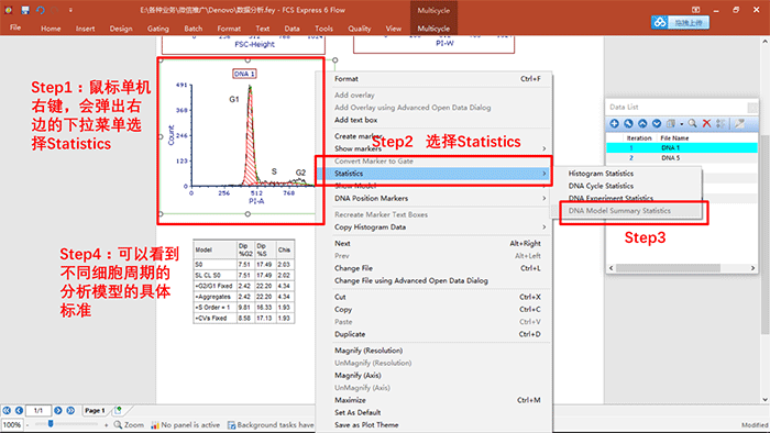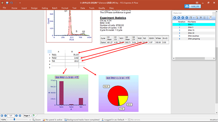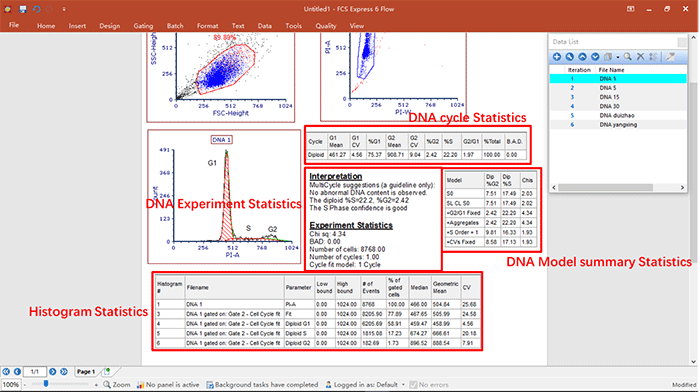 ? 演示內容:細胞周期數(shù)據(jù)的分析,關于細胞周期各個參數(shù)的調用,統(tǒng)計學圖表的建立