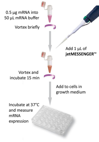 mRNA轉(zhuǎn)染是針對難轉(zhuǎn)染細(xì)胞如神經(jīng)元、原代細(xì)胞和懸浮細(xì)胞(淋巴細(xì)胞)的一種新的解決方法。這種轉(zhuǎn)染方法相較于DNA轉(zhuǎn)染有很多優(yōu)點:更高的轉(zhuǎn)染效率、轉(zhuǎn)染后更快速的蛋白表達以及較低的基因插入突變風(fēng)險。mRNA瞬時轉(zhuǎn)染可用于很多用途,包括細(xì)胞重編輯,基因編輯(CRISPR/Cas9)及疫苗研發(fā)。Polyplus-transfection?公司研發(fā)了一款新型的mRNA轉(zhuǎn)染試劑jetMESSENGERTM,難轉(zhuǎn)染細(xì)胞現(xiàn)在很容易轉(zhuǎn)染!