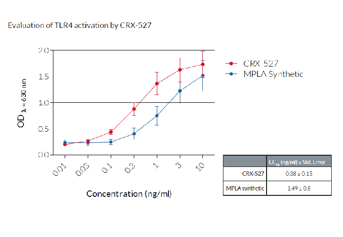 將細胞分別與遞增濃度的CRX-527、合成的單磷酰脂質A(MPLA)孵育。在HEK-BlueTM檢測培養(yǎng)基(SEAP檢測生長培養(yǎng)基)中孵育過夜后,通過測定上清液中是否存在SEAP來評估TLR4的活化。數據表示為OD(λ=630nm)(±SEM)
