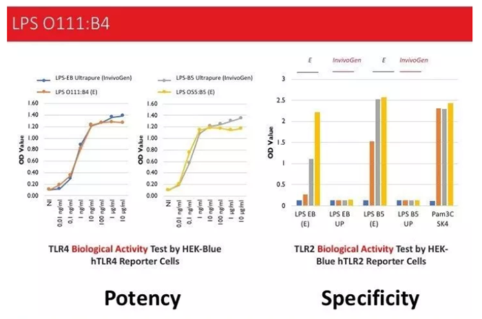 比較InvivoGen和E品牌TLR4特異性LPS(Utrapure)發(fā)現,E品牌雖然號稱TLR4 specific agonist,但是可同時激活TLR2和TLR4,而InvivoGen的Ultrapure LPS只能特異性激活TLR4。