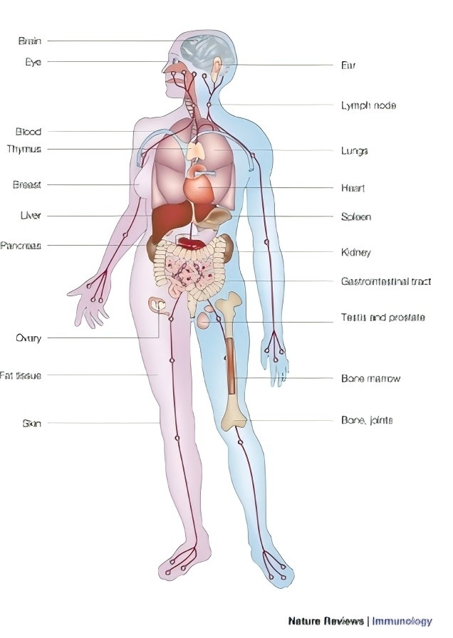 起初,T 細(xì)胞被認(rèn)為是免疫系統(tǒng)中 MIF 的主要細(xì)胞來(lái)源。然而,后來(lái)的文獻(xiàn)證明了單核細(xì)胞、巨噬細(xì)胞、血液中的樹突狀細(xì)胞、B 細(xì)胞、中性粒細(xì)胞、嗜酸性粒細(xì)胞、肥大細(xì)胞和嗜堿性粒細(xì)胞均表達(dá)MIF。值得注意的是,MIF 也由與宿主自然環(huán)境直接接觸的細(xì)胞和組織表達(dá),例如肺、皮膚上皮層以及胃腸道和泌尿生殖道。其另一個(gè)顯著特征是在內(nèi)分泌系統(tǒng)的幾個(gè)組織中高水平表達(dá),尤其是參與應(yīng)激反應(yīng)的器官(下丘腦、垂體和腎上腺)。