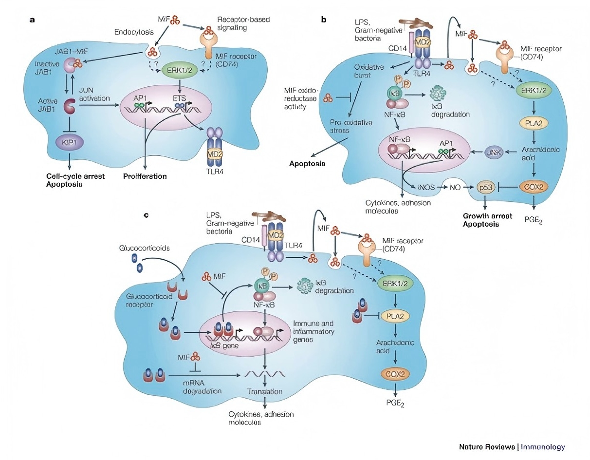 當(dāng)用 LPS 刺激時(shí),巨噬細(xì)胞釋放 MIF。免疫細(xì)胞的其他促炎效應(yīng)分子,如 TNF 和 IFN-γ,也是巨噬細(xì)胞產(chǎn)生 MIF 的強(qiáng)誘導(dǎo)劑。MIF 在組織或體循環(huán)中釋放后,作為一種經(jīng)典的促炎細(xì)胞因子,通過(guò)激活巨噬細(xì)胞和 T 細(xì)胞來(lái)促進(jìn)先天性和適應(yīng)性免疫反應(yīng)。