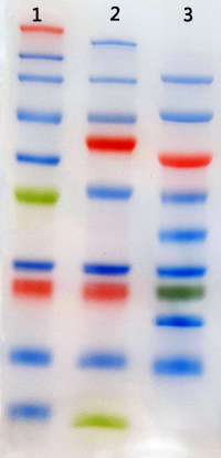 預(yù)染蛋白Marker是將幾種純化好的蛋白,與染料共價(jià)偶聯(lián)后混合而成。預(yù)染蛋白Marker的出現(xiàn)方便我們?cè)陔娪緯r(shí)、電泳后以及轉(zhuǎn)膜后檢測(cè)電泳情況和估計(jì)遷移率,是做WesternBlot最常用到的蛋白Marker。