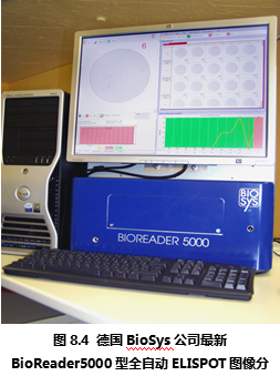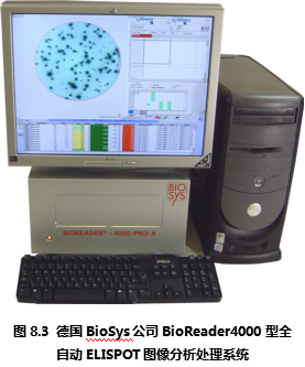 德國(guó)Bio-Sys公司從上世紀(jì)80年代開始就致力于生物圖像識(shí)別領(lǐng)域,在進(jìn)入ELISPOT圖像分析儀市場(chǎng)后一直以其先進(jìn)的ELISPOT斑點(diǎn)識(shí)別技術(shù)聞名。德國(guó)Bio-Sys公司首先解決了顯微攝像系統(tǒng)難以定位96孔板上的每一個(gè)孔的問題。其解決方法基于圖像識(shí)別技術(shù),利用板孔邊壁和真正的孔底的細(xì)微差別,在機(jī)械定位的基礎(chǔ)上,通過軟件識(shí)別來進(jìn)一步提高每孔的定位精度。是目前市場(chǎng)上所有ELISPOT圖像分析儀中唯一能夠完整識(shí)別整個(gè)孔底ELISPOT斑點(diǎn)圖像的設(shè)備。在對(duì)真假斑點(diǎn)的分辨中,德國(guó)Bio-Sys公司除了具備完善的物理學(xué)多參數(shù)識(shí)別技術(shù),還特別針對(duì)ELISPOT斑點(diǎn)形成的生物學(xué)過程,通過細(xì)胞因子顯色后的“光密度”峰值積分分析方法,精確分辨真假斑點(diǎn)、融合斑點(diǎn)等復(fù)雜情況。Bioreader系列ELISPOT圖像分析儀國(guó)外大多數(shù)較有經(jīng)驗(yàn)的ELISPOT實(shí)驗(yàn)室推崇的特點(diǎn)為:專業(yè)性和參數(shù)全開放性。因?yàn)镋LISPOT實(shí)驗(yàn)的復(fù)雜性,ELISPOT斑點(diǎn)形成在不同的實(shí)驗(yàn)條件下有非常大的差異。這就對(duì)ELISPOT圖像分析儀提出了較高的要求:既要能夠保證斑點(diǎn)計(jì)數(shù)的真實(shí)性和一致性,又要能夠根據(jù)不同情況,通過實(shí)驗(yàn)者的判斷來校正儀器對(duì)ELISPOT斑點(diǎn)識(shí)別的標(biāo)準(zhǔn)。要同時(shí)實(shí)現(xiàn)以上兩個(gè)要求,唯一的辦法是將儀器的所有判斷標(biāo)準(zhǔn)向ELISPOT實(shí)驗(yàn)者開放,實(shí)現(xiàn)實(shí)驗(yàn)者和儀器的互動(dòng)。在這一方面,德國(guó)Bio-Sys公司始終走在ELISPOT斑點(diǎn)識(shí)別領(lǐng)域的前列,新的Bioreader-4000型(圖8.3)和Bioreader -5000(圖8.4) 型在專業(yè)性和適用性方面都領(lǐng)先于其他廠家的設(shè)備。