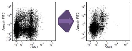 圖為:體外培養(yǎng)一天的C57BL/6小鼠脾細(xì)胞做Annexin V/7-AAD染色的流式數(shù)據(jù)。其中,左邊為未經(jīng)固定處理的細(xì)胞上機(jī)檢測結(jié)果; 右邊為經(jīng)過70%EtOH, 1.5%PFA固定處理的細(xì)胞上機(jī)檢測結(jié)果。