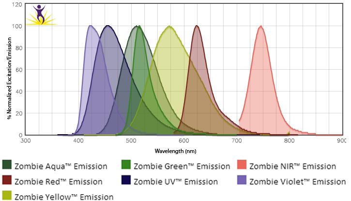 Zombie Dyes有別于PI和7-AAD等DNA染料,它是一種可用于需固定細(xì)胞實驗的染料,通過與細(xì)胞上蛋白質(zhì)的氨基結(jié)合來實現(xiàn)。因活細(xì)胞可排除染料,所以僅細(xì)胞膜被著色;而死細(xì)胞的細(xì)胞膜及細(xì)胞質(zhì)均被著色,繼而根據(jù)熒光信號的強(qiáng)弱來區(qū)分死/活細(xì)胞。而且Zombie Dyes可選擇性多,可以由不同的激發(fā)光激發(fā),便于靈活選擇。