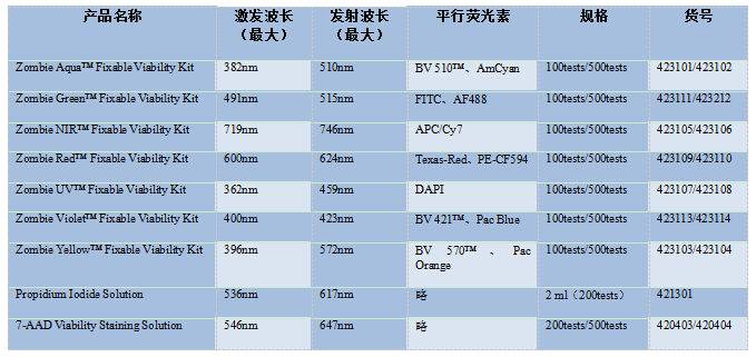 當(dāng)流式檢測只分析細(xì)胞表面抗原分子,且不對樣本固定時,7-AAD和PI是比較理想和經(jīng)典的方法。但是如果需要分析細(xì)胞內(nèi)的分子,如檢測胞內(nèi)細(xì)胞因子、胞內(nèi)活化的激酶和核內(nèi)分子等需要固定樣本細(xì)胞,在胞膜上打孔,使熒光素偶聯(lián)抗體能夠通過細(xì)胞膜進(jìn)入細(xì)胞內(nèi),與相應(yīng)目標(biāo)分子結(jié)合,這時7-AAD與PI就無法鑒別死細(xì)胞和活細(xì)胞了。