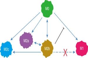 不同類型巨噬細(xì)胞的表型轉(zhuǎn)換。M0型巨噬細(xì)胞可以在不同誘導(dǎo)劑的作用下極化為M1或M2(M2a、M2b、M2c)。M2b型巨噬細(xì)胞可以在不同刺激下轉(zhuǎn)換為M2型巨噬細(xì)胞的其他亞型。值得注意的是,M2b型巨噬細(xì)胞抑制從M0到M1的轉(zhuǎn)換。此外,在M1刺激劑的條件下,M2b型巨噬細(xì)胞不能重新極化為M1型。