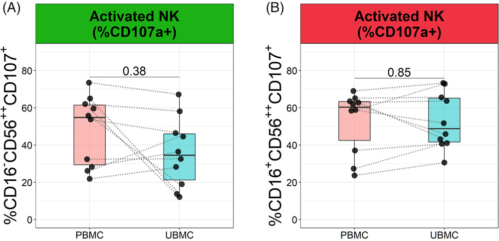為了比較CD16-CD56++和CD16+CD56++細(xì)胞在胎盤床和外周血中的活化狀態(tài),本文檢測了細(xì)胞表面脫顆粒標(biāo)志物CD107a的表達(dá)。胎盤床血中活化CD16-CD56++細(xì)胞的百分比與外周血相當(dāng)(分別為35.87 ± 5.84%和47.84 ± 5.91%)(圖3A)。同樣,胎盤床血中活化CD16+CD56+細(xì)胞的百分比與外周血相似(分別為52.86 ± 4.74%和52.76 ± 5.29%)(圖3B)。