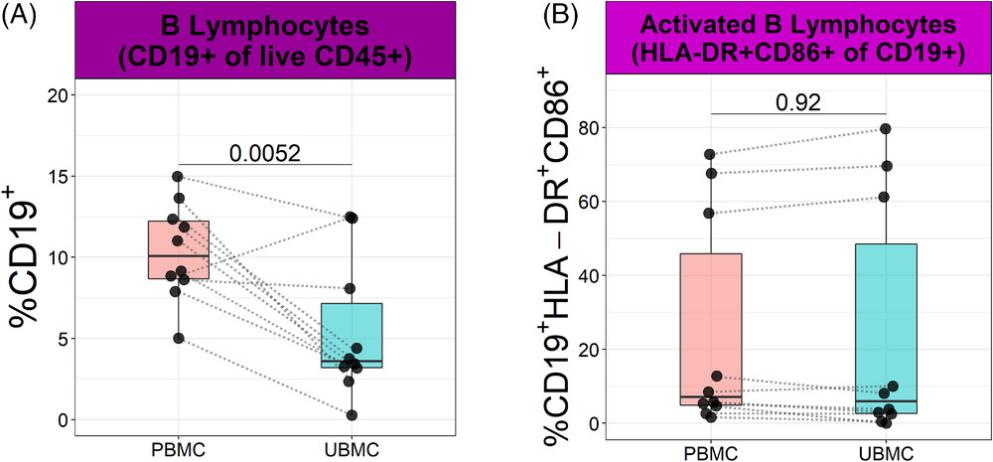 外周血B細(xì)胞(CD45+CD3-CD19+)占總活的CD45+白細(xì)胞比例高于胎盤床樣品(分別為10.34 ± 0.94%和5.36 ± 1.33%)(圖6A)。為了研究B細(xì)胞的活化狀態(tài),本文還檢測了CD86和人類白細(xì)胞抗原(HLA)II類分子HLA-DR的表達(dá)。外周血和胎盤床樣品中表達(dá)這兩種受體的B細(xì)胞比例相似(圖6B)。