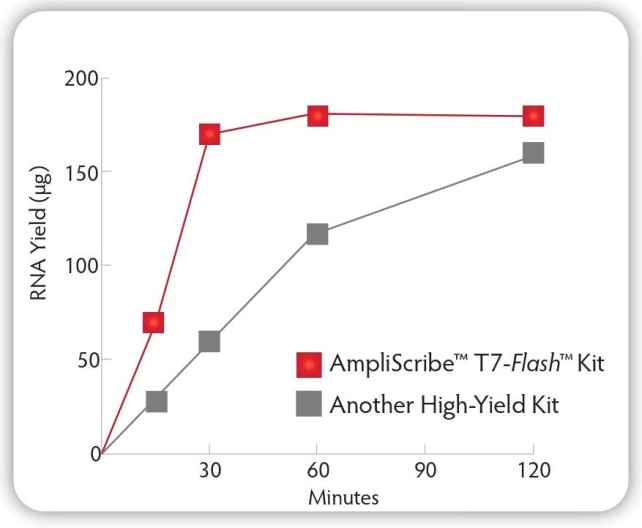 △圖1 AmpliScribeT7-Flash Transcription Kit比競爭品牌更快獲得更高產(chǎn)量RNA