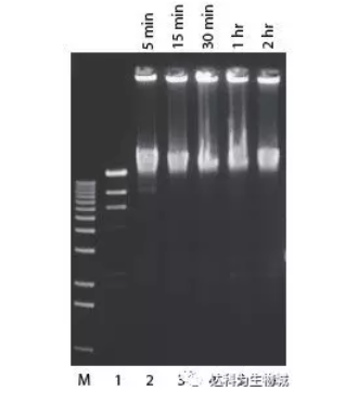 按標(biāo)準(zhǔn)連接反應(yīng)使用2U Fast-Link? ligase進行Lambda Hind III markers連接(泳道2-6). 泳道M, 1-kb ladder;泳道1,無酶對照;泳道2-6, 分別為5 min, 15 min, 30 min, 1 hr, 2 hr連接結(jié)果。