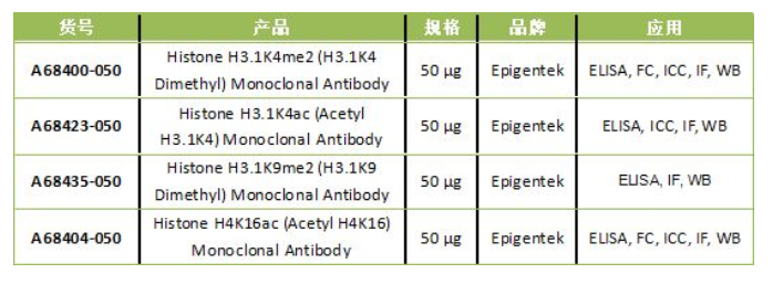 Epigentek提供多種新型兔單克隆抗體,用于表觀遺傳學(xué)研究。與傳統(tǒng)的小鼠單克隆抗體相比,這些抗體提供更高親和力,更高特異性,更好地識(shí)別抗原表位。