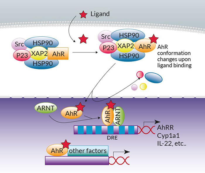 典型AhR訊號已經(jīng)被廣泛綜述過1。簡而言之,在沒有配體的情況下,AhR位于細胞質(zhì)中Hsp90:XAP2:p23:Src伴侶蛋白復(fù)合物內(nèi),當(dāng)配體結(jié)合時,復(fù)合物發(fā)生構(gòu)象變化并轉(zhuǎn)移到細胞核中。伴侶蛋白被釋放,AhR和AhR核轉(zhuǎn)位子(ARNT)異源二聚。在細胞核中,AhR:配體:ARNT三聚體與AhR靶基因上游調(diào)節(jié)區(qū)域的二噁英應(yīng)答元件(DRE)結(jié)合,以控制包括細胞色素P450依賴性單加氧酶Cyp1a1、AhR 抑制因子(AhRR)和IL-22白細胞介素的轉(zhuǎn)錄。值得注意的是,無輪是在基因組水平上通過與其他轉(zhuǎn)錄因子(例如NF-κB)相關(guān)聯(lián),還是在非基因組水平上(例如通過釋放Src激酶),非典型AhR信號通路也有被報道過2,3。