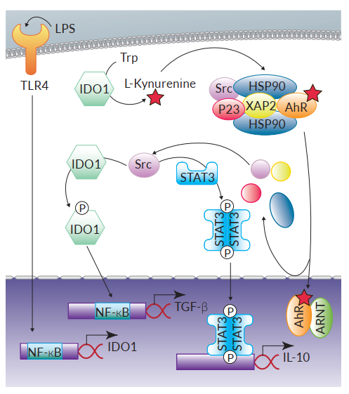 AhR參與調(diào)節(jié)促炎反應(yīng)和耐受反應(yīng)的機制可以從多方面解釋,除了前文提過可以導(dǎo)致IL-22產(chǎn)生的典型AhR信號,AhR也通過非基因組途徑導(dǎo)致至少兩個抑制性效果。研究發(fā)現(xiàn)與AhR相關(guān)的Src激酶能夠磷酸化吲哚胺2,3-雙加氧酶(IDO1),進而激活NF-κB轉(zhuǎn)錄因子誘導(dǎo)DCs中抑制性細胞因子TGF-β(transforminggrowth factor)的轉(zhuǎn)錄,達到抑制小鼠對LPS的過度應(yīng)答9。此外, IDO1對Trp的降解提供了例如L-型犬尿氨酸(L-Kynurenine)的AhR激動劑,提示了這通路與Treg的產(chǎn)生有關(guān)9。在巨噬細胞中,AhR另一個抑制作用是在LPS誘導(dǎo)下,AhR協(xié)同Src激酶和STAT3信號通路產(chǎn)生抗炎細胞因子IL-10。值得留意的是,TLR4對LPS的識別可促進巨噬細胞中AhR的表達,但目前尚不清楚在其他模式識別受體配體刺激的情況下是否也是如此10。