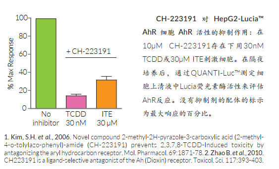 HT29-Lucia?AhR細胞和HepG2-Lucia?AhR細胞通過監(jiān)測Cyp1a1誘導(dǎo)的Lucia熒光素酶活性提示AhR激活狀況。微粒體細胞色素P450依賴性單氧化酶Cyp1a1基因是重要的AhR靶基因,在這兩個細胞系中,Lucia熒光素酶報告基因都在人Cyp1a1的完整調(diào)控序列的控制之下。當(dāng)配體結(jié)合時,細胞質(zhì)AhR發(fā)生構(gòu)象改變,跨膜進入細胞核,并與ARNT結(jié)合,以結(jié)合Cyp1a1調(diào)節(jié)序列中的二惡英反應(yīng)元件(DRE)。 AhR的激活可以通過QUANTI-Luc?測定細胞培養(yǎng)上清中分泌的熒光素酶活性來評估。HT29-Lucia? AhR細胞和 HepG2-Lucia? AhR細胞對Zeocin?具有抗性。兩種細胞系都用TCDD、FICZ、ITE和L-KynureninePlus(L-型犬尿氨酸的制備物)進行了功能測試。
